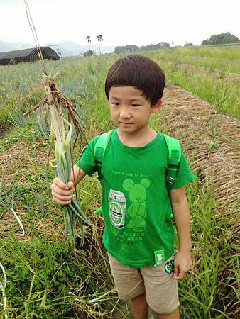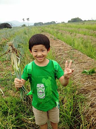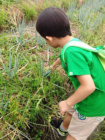 小牛弟原本有點起床氣,在聽完導覽後就變得躍躍欲試,連拔了兩把蔥還頗得意。