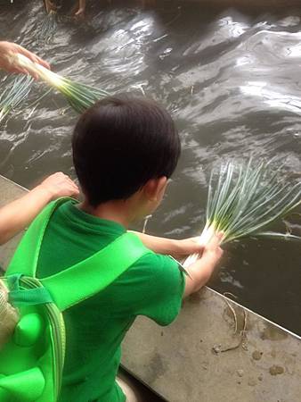 小牛弟有模有樣的把手上的蔥洗乾淨了。接著放旁邊,我想這些體驗拔蔥應該是接下來我們做蔥餅的來源吧!