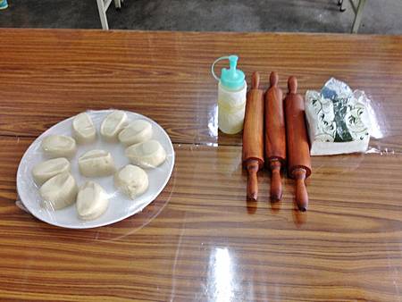 桌上的是今天蔥餅DIY的材料,麵糰/桿麵棍/蔥/油