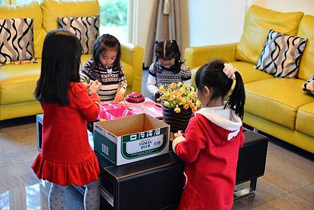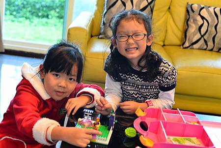 陸陸續續人員到齊,小女生們就自己成群結隊在客廳玩著女生的遊戲-積木