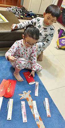 時間拉回兩週前,這是我們在家裡加工的照片,這一個一個紅包裡的小禮物及報紙條