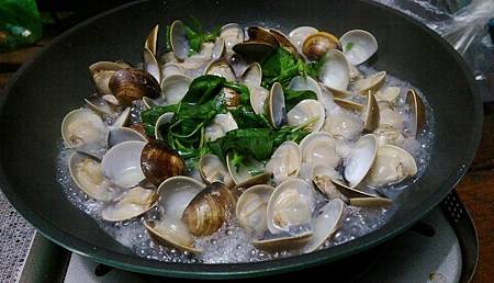 第二道,九層塔蛤蜊,這張真的拍得有夠讚的!蛤蜊鮮湯及青綠色的九層塔,看起來實在肥美又好吃。