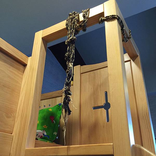 來看看這個雙層床,共可睡四個人,是一座算很大型的溜滑梯床,一邊可攀岩一邊可溜滑梯(但有點陡)