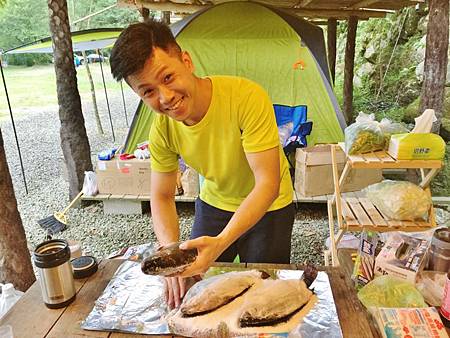 在忙完自製桶仔雞之後,開始弄鹽烤魚!!!天啊~~~這不是餐廳裡的功夫菜嗎?聽說為了這次露營他準備了一個禮拜以上!