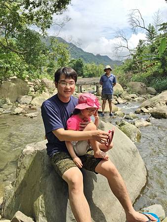坐在石頭上泡泡腳,讓她慢慢嚐試,最後還是有成功把她帶進水裡玩~