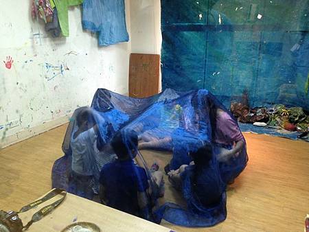 用藍紗布象徵大海媽媽的擁抱,在輕撫臉頰的互動中,小朋友在地上翻滾笑得很開心,