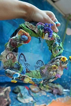 運用膠水.白膠開始把珊瑚及花草黏上花圈上,