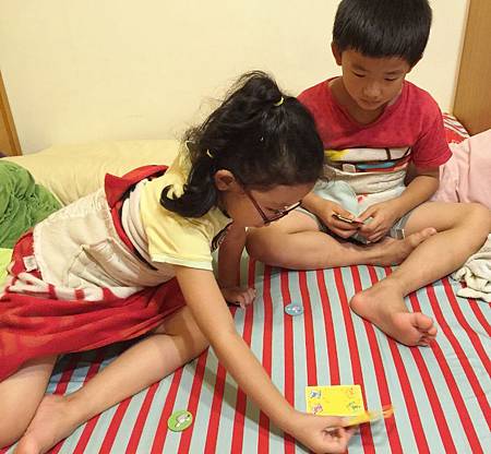 哥哥為了不讓妹妹蓋到他的顏色老鼠,會以蓋住媽媽的為第一考量給妹妹建議!!(是不是學很快~)