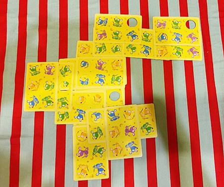 示範玩法就如下,一張卡疊一張卡(要蓋住1-2隻老鼠),而從洞中探出頭來的顏色就可得分,
