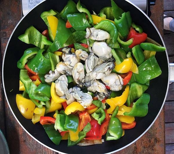 先清燙鮮蚵、爆香蔥白、伴炒青黃紅淑後即可上桌,後來大廚有再加上營區現採金桔汁去腥,讚!