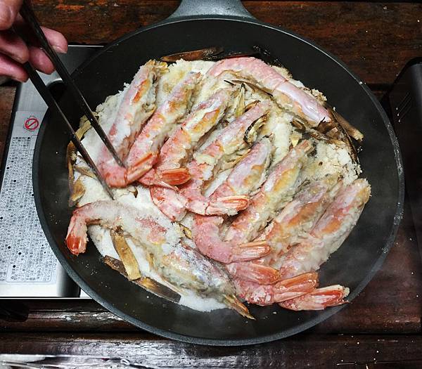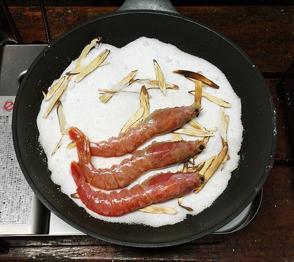 先把平底鍋舖上鹽巴,灑上甘草片再把紅蝦舖上直接悶烤即可,保留海鮮的原味~