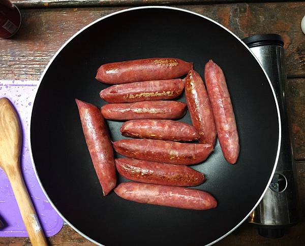 本來想用烤的,但烤肉的東西也蠻多的,所以直接下鍋煎。煮法很簡單就和在家煎香腸一樣的簡單~