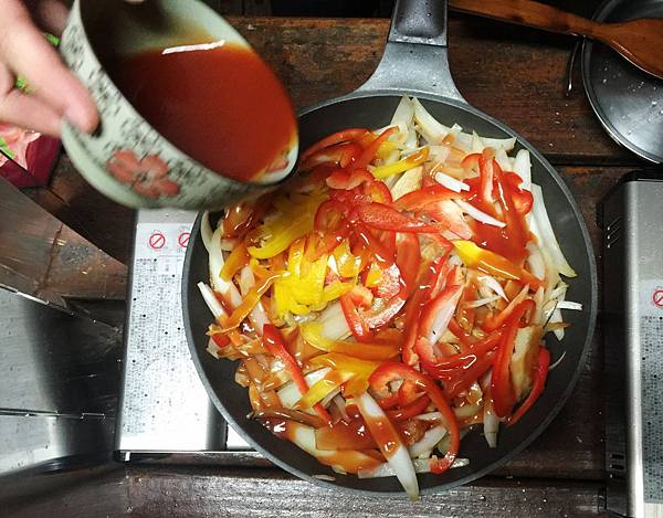 洋蔥炒香後加入紅黃椒及甜不辣炒好後,再加入蕃茄醬佐料拌炒,就ok了!簡單吧~