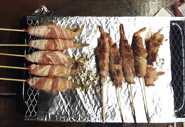 裡面的草蝦都已撥好殼了,外面裹上一層培根,在烤肉架上滋滋作響,