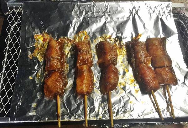 當它還躺在烤肉架上時...都已一串一串被貼上預約姓名了...搶著吃啊!