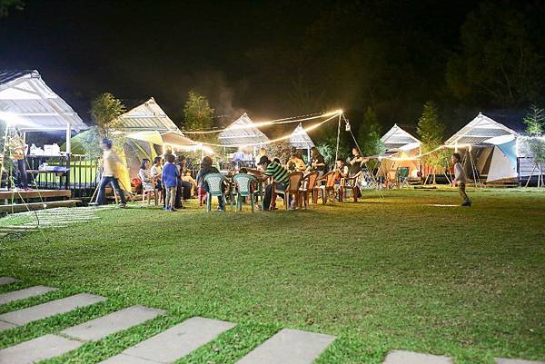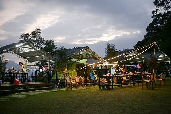我很喜歡這張照片,天空上的雲層光影、烤肉趴的場地燈光、忙碌的露友們、棚位場地每一個角落都很到位的美~