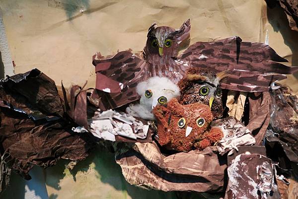 在轉角處有一樹洞裡有六隻小角鴞,這是另一位小一生芊芸的創作,
