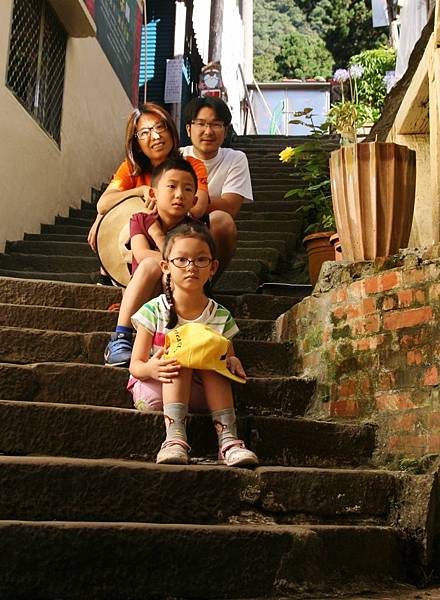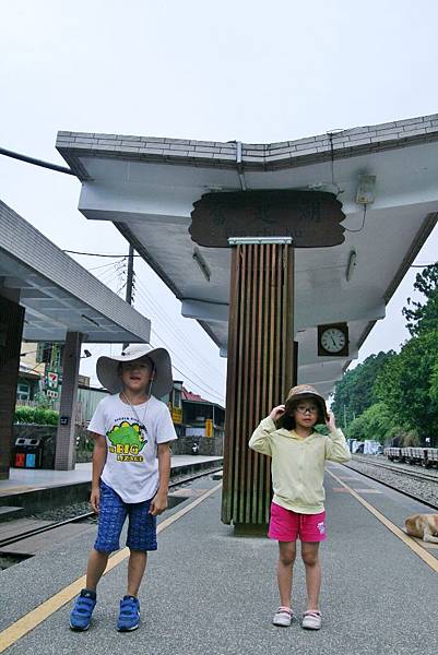 又有全家大合照了!趁第二天早起,放了個腳架在月台,輕輕鬆鬆慢條斯理的與奮起湖指標牌合照。