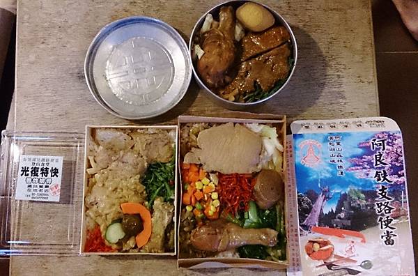 上方是奮起湖大飯店的便當(鐵盒用完要再拿下去還它們)