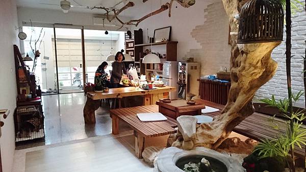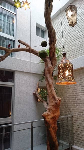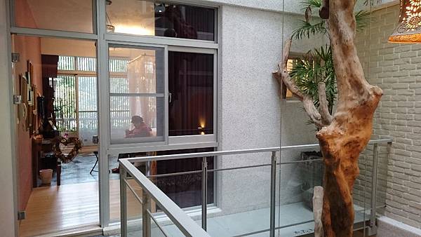 台南自在安平民宿的經典特色:有一棵樹從客廳一路貫穿到屋頂,民宿女主人說是她從東南亞特地運進來做為這棟民宿的特色裝置藝術的。