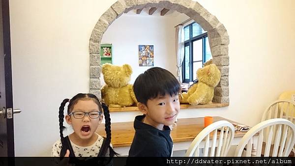 這是兩小在波希瓦舍館的一樓客廳吃早餐時拍的,