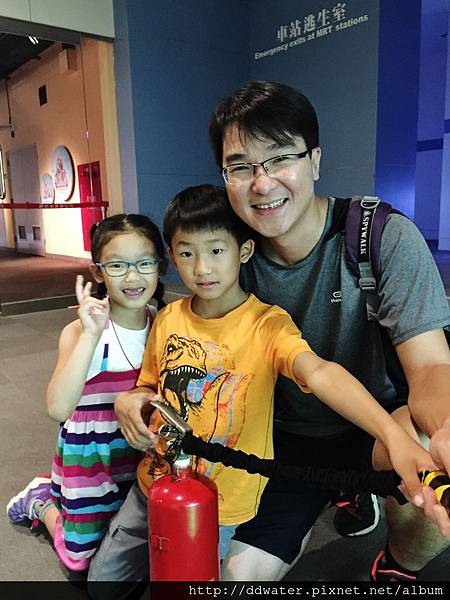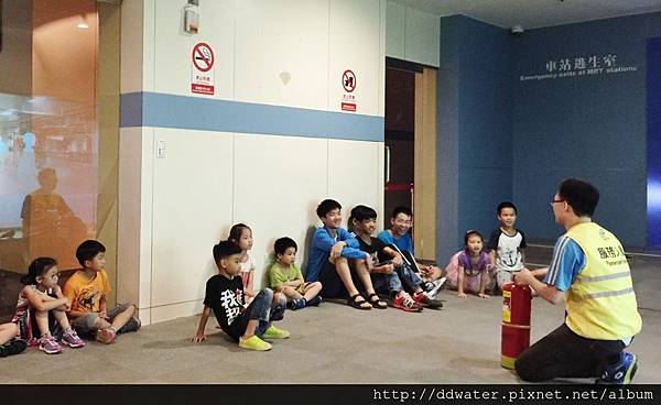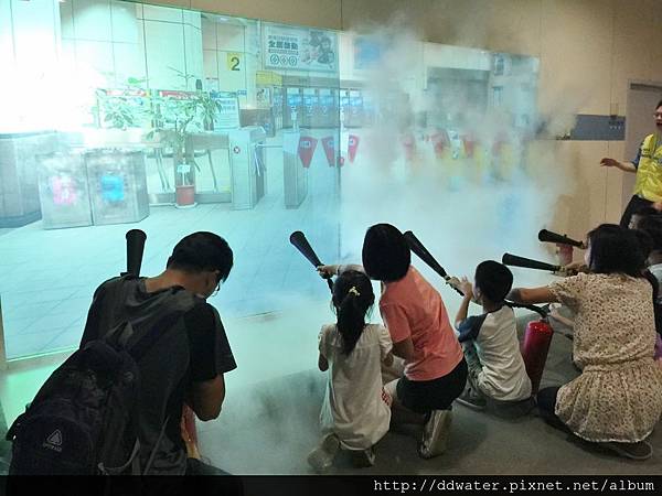 你瞧,兩小聽得多~認真?哥哥在教滅火器的使用。如何拔插梢,如何噴出CO2?