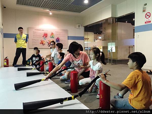 聽哥哥介紹完後,就要親自上陣囉!因為媽媽負責拍照,所以由爸爸一打二進行滅火體驗。