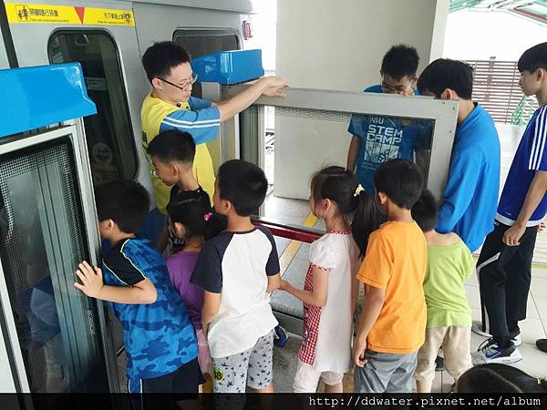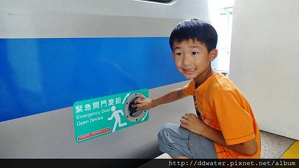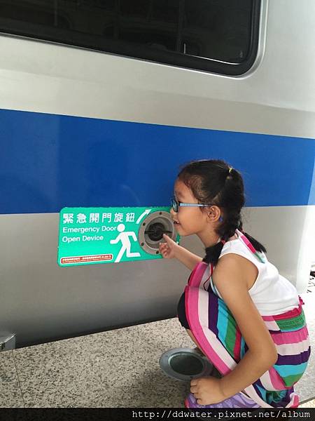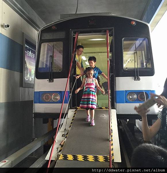 走到第一節司機車廂,有一個車前方的消生門,讓小朋友實際體驗一下在隧道中逃生的感覺。