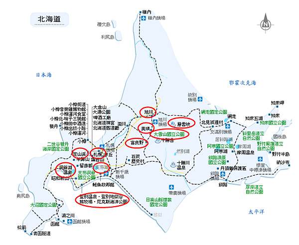 北海道地圖:(去的地方我用紅色圈圈畫起來)