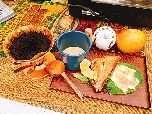 第二天的早餐~~~哇!!!超級夢幻的早餐組合,現煮咖啡、磚壓三明治、起司、蛋沙拉及蘋果,還有應景的棒球!