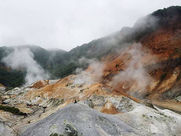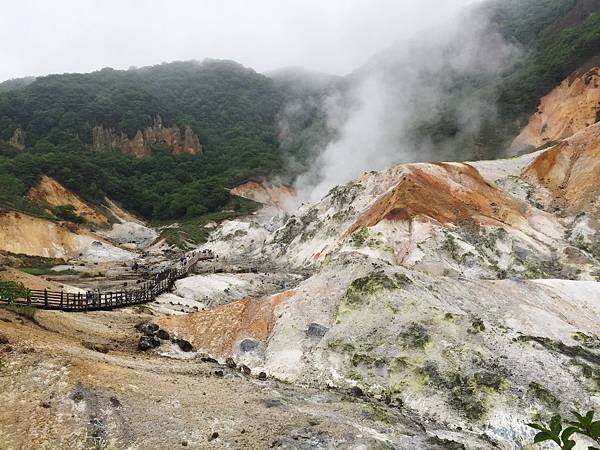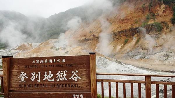 這是一個一萬年前形成的火山口遺跡,目前有直徑大約450米的地方仍在冒白煙,而且週圍寸草不生,而這附近知名的登別溫泉的溫泉源頭就是從這裡所提供,有多達11種不同礦物質的泉水從這裡流出,創造了知名的登別溫泉。