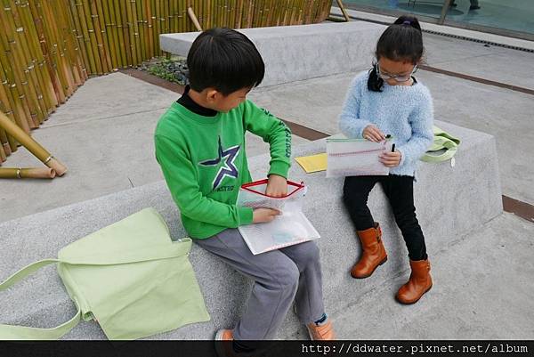 所以這一個作品的任務是採集北美館的土壤留下記錄,兩小手忙腳亂的跑到戶外採集土壤黏到明信片上完成此任務!