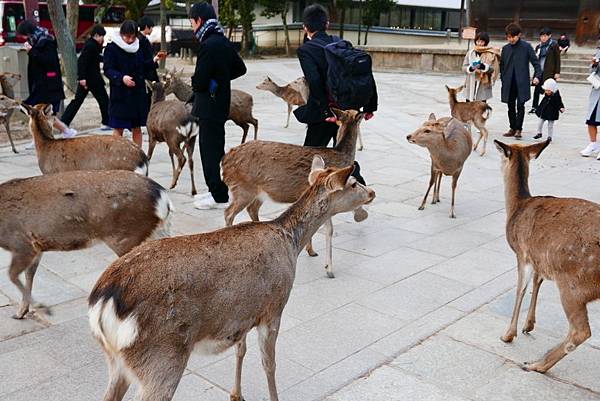 看來似乎是巧遇日本中學的校外教學,遊客多連日本的學生也多,快到之前友人就一再提醒千萬不要買仙貝來餵,不然會被鹿群包圍。