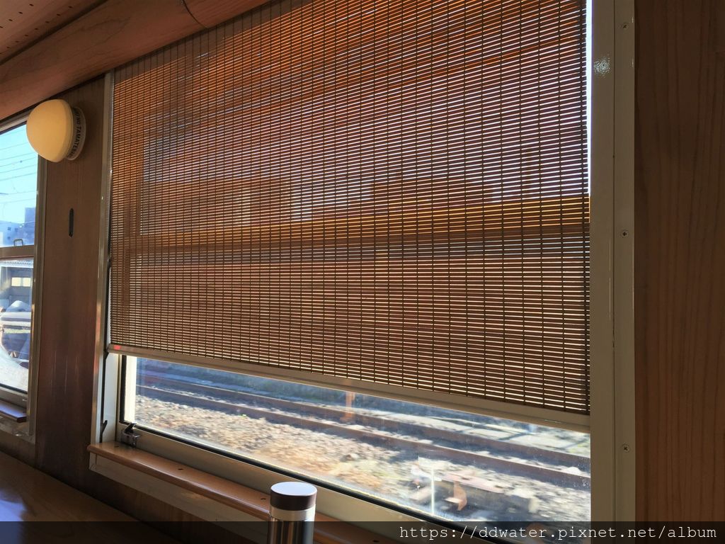 列車啟動,陽光頗刺眼,拉下了窗簾更是一個巧思,是竹簾的設計。