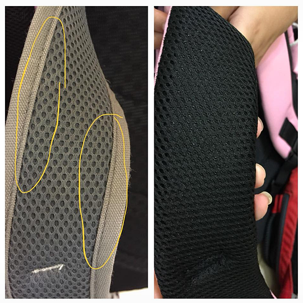 新舊書包背後比一比,都有胸扣,背帶加厚加大,背部皆有考量散熱的設計,