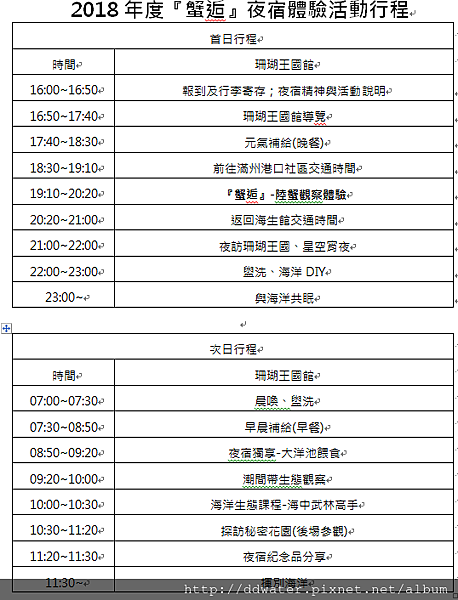 夜宿海生館活動行程表如下,基本上最晚4點要報到!