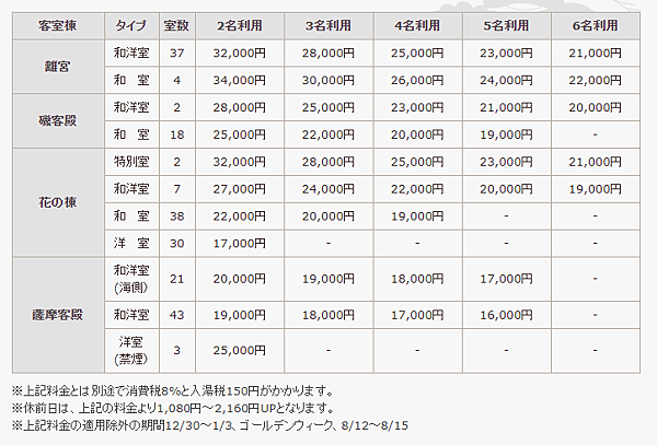 定價從低到高分別是:離宮>磯客殿>花之棟>薩摩客殿