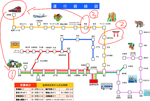 下面是宮崎公車的運行路線,本來,我的路線如下